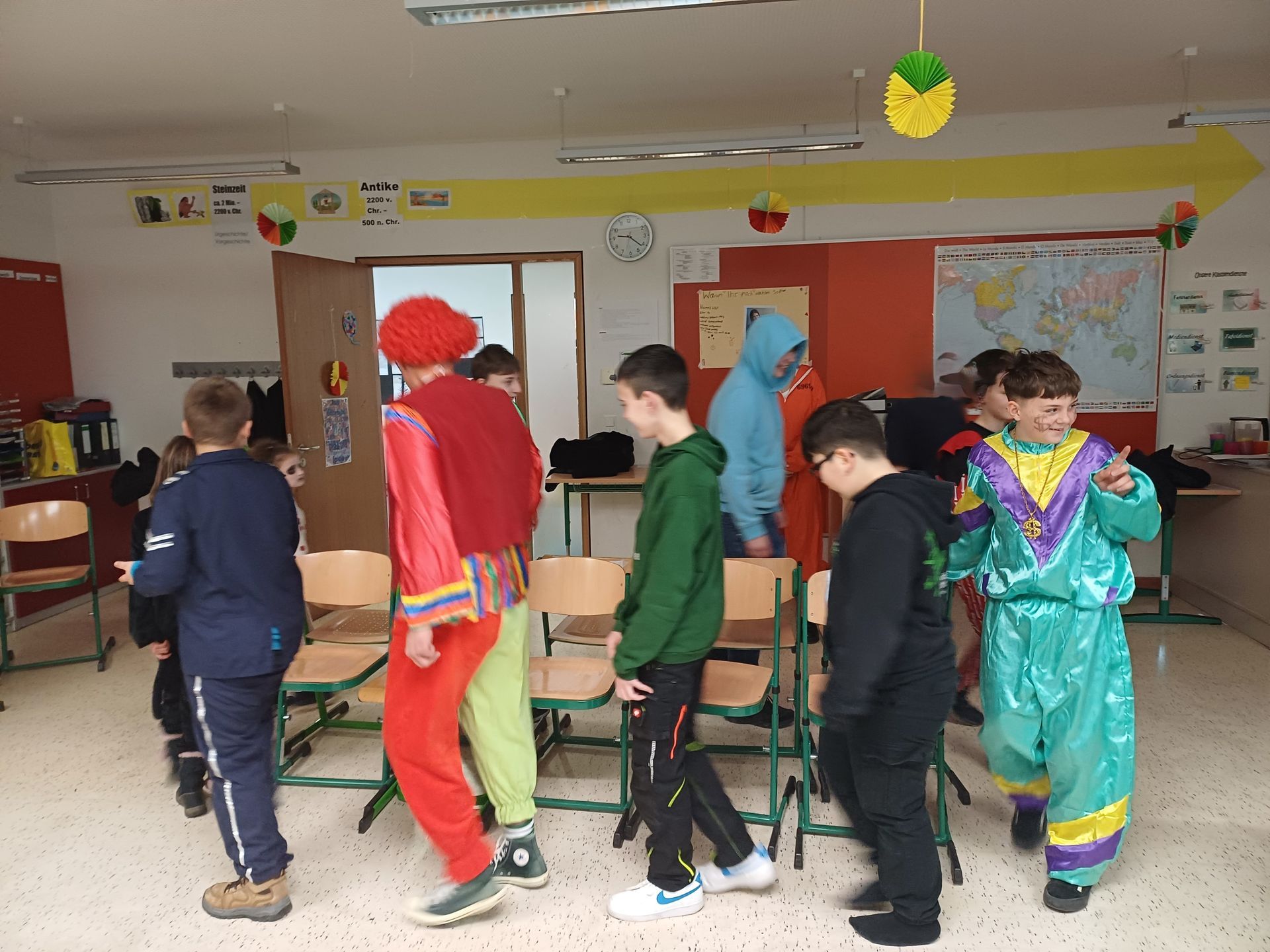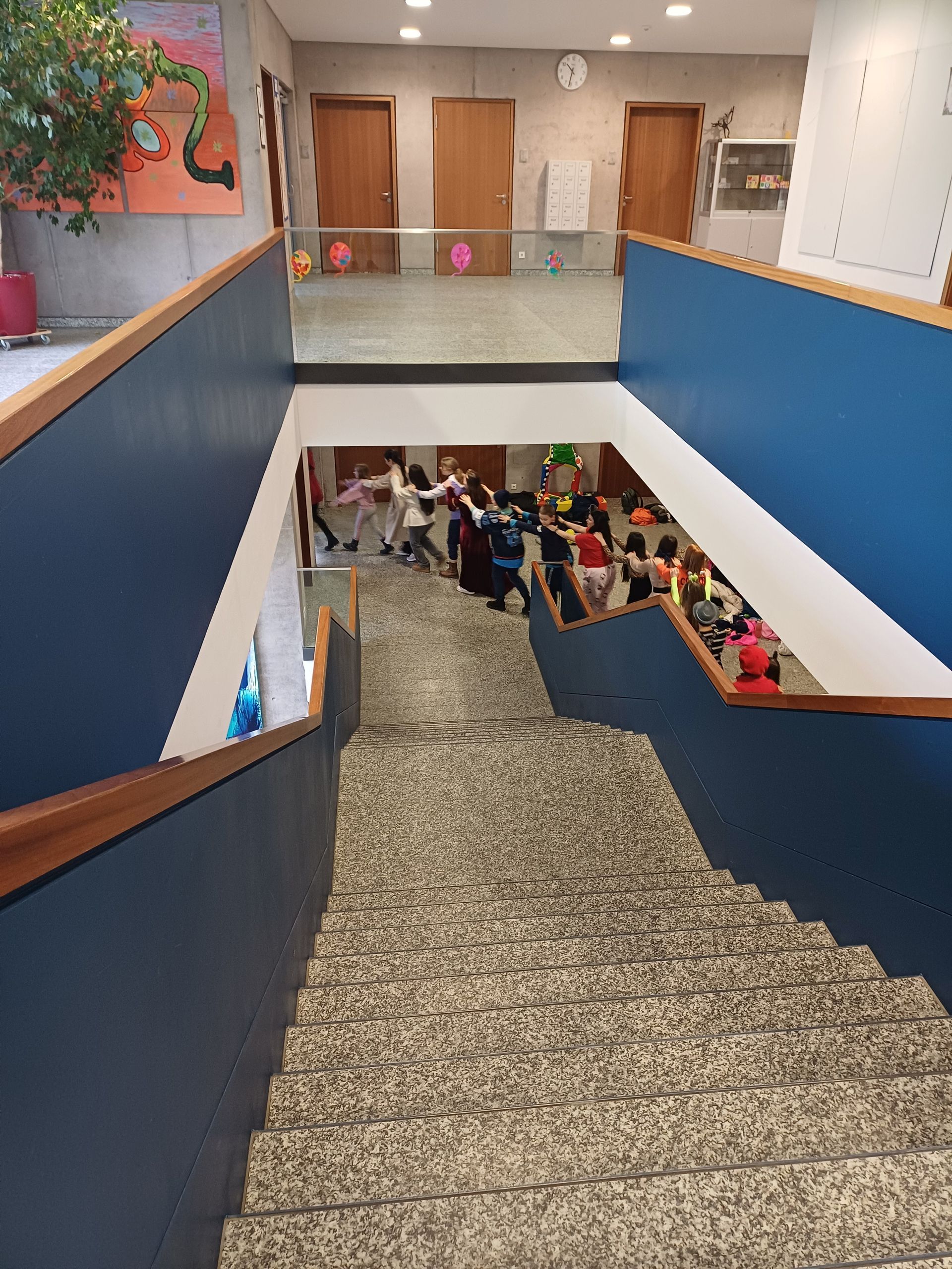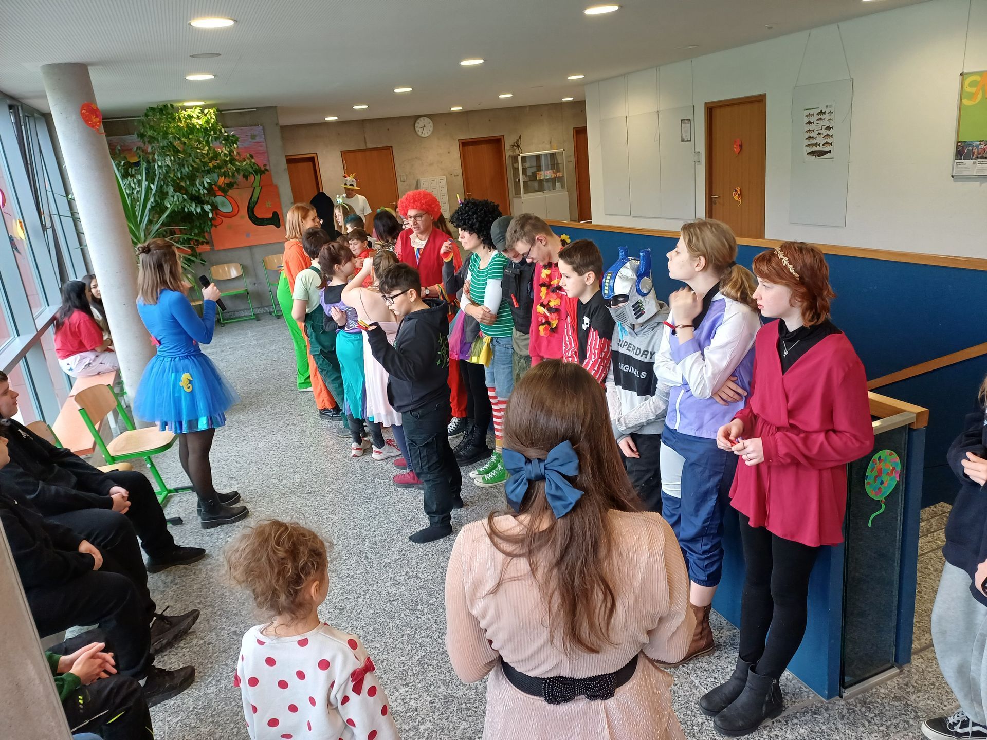 Unter dem diesjährigen Motto "kunterbunt" wurde am schmotzigen Doschdig ordentlich gelacht, getanzt und gespielt. Die Schüler/Innen hatten einen Raum in dem sie sich mit köstlichen, zum Teil selbstgebackenen Leckereien, stärken konnten. Die Grundstufe hat alle mit tollen Cocktails versorgt. Außerdem gab es einen Ruheraum in dem man sich auch schminken lassen konnte und im Klassenzimmer der Oberstufe konnte man tanzen und spielen. Natürlich gab es auch den traditionellen Kostümwettbewerb.