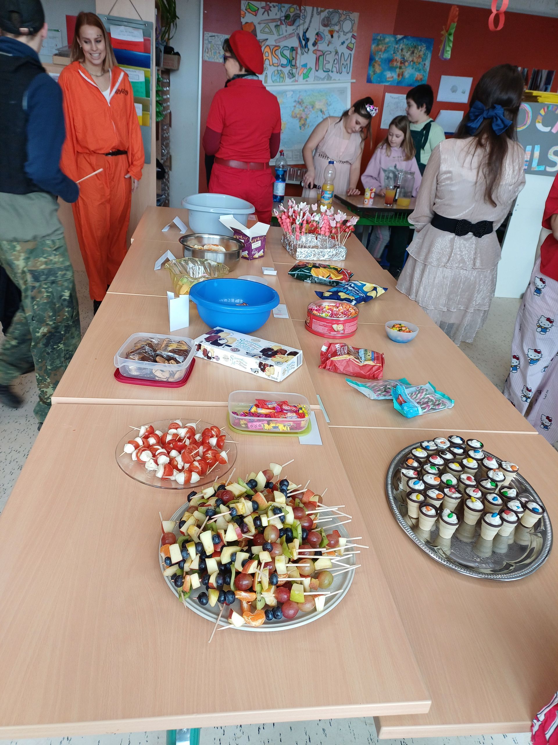 Unter dem diesjährigen Motto "kunterbunt" wurde am schmotzigen Doschdig ordentlich gelacht, getanzt und gespielt. Die Schüler/Innen hatten einen Raum in dem sie sich mit köstlichen, zum Teil selbstgebackenen Leckereien, stärken konnten. Die Grundstufe hat alle mit tollen Cocktails versorgt. Außerdem gab es einen Ruheraum in dem man sich auch schminken lassen konnte und im Klassenzimmer der Oberstufe konnte man tanzen und spielen. Natürlich gab es auch den traditionellen Kostümwettbewerb.