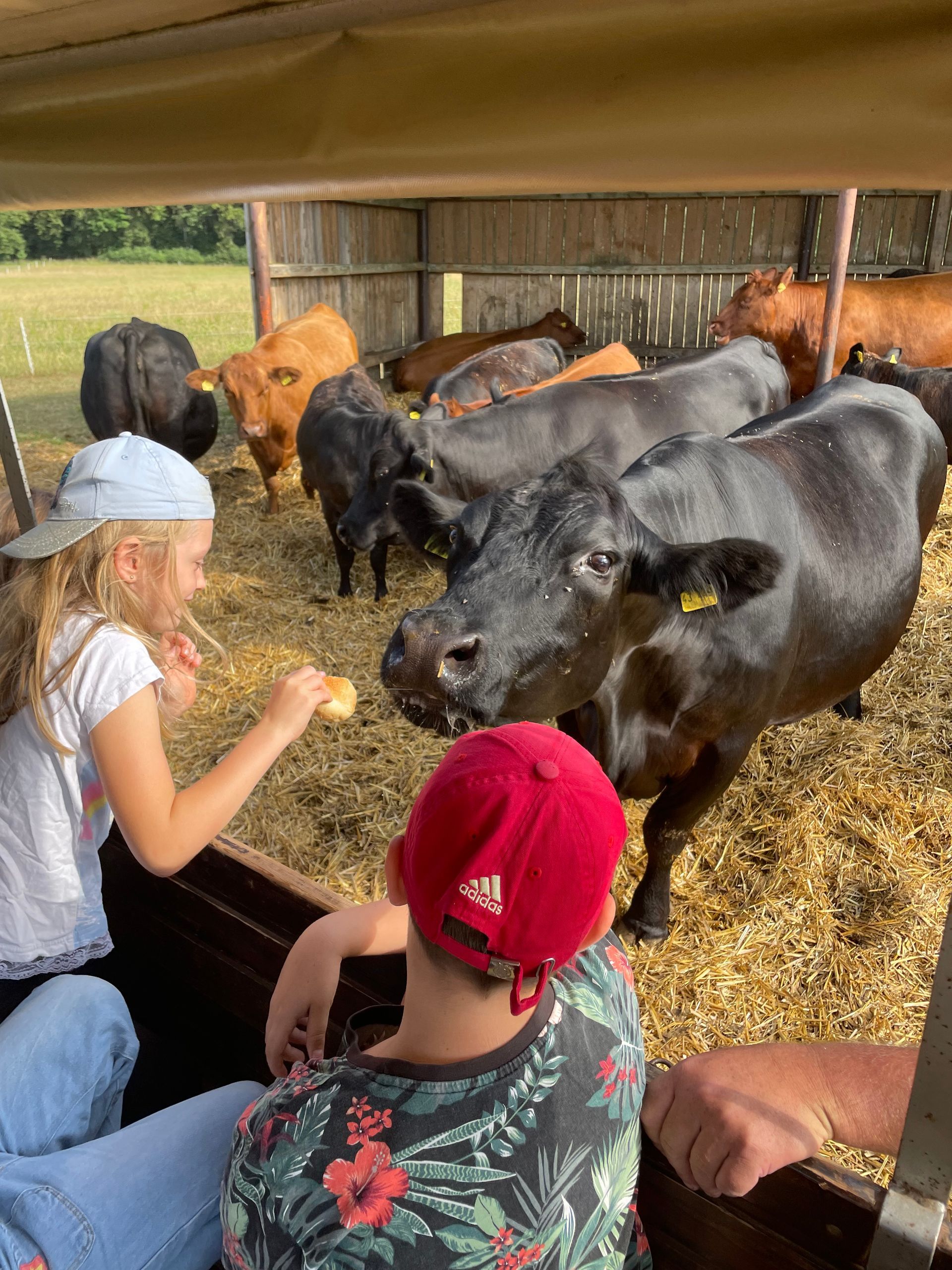 Dort führte die Familie Bregenzer die Schüler/Innen durch das Hofleben: sie durften mit einem Traktor + Hänger zu den Weiden fahren, wo die Angus- Rinder ein glückliches Leben führen können.